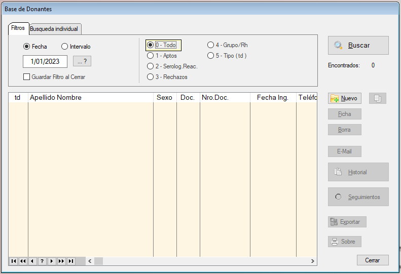 Desde la ventana de Base de Donantes se accede a la Base de datos de Personas que figuran como Donantes (de Unidades o Predonantes).