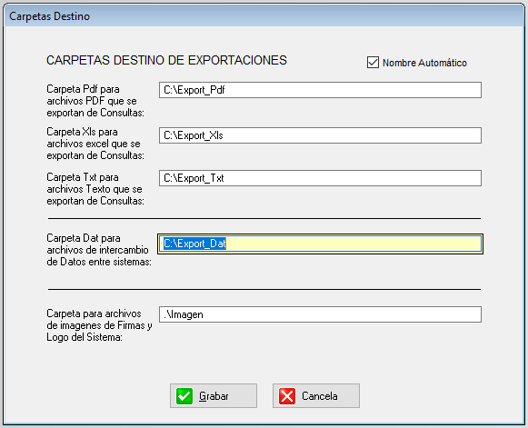 Esta ventana permite definir las Carpetas donde se guardarán de forma automática los distintos tipos de archivo del sistema.