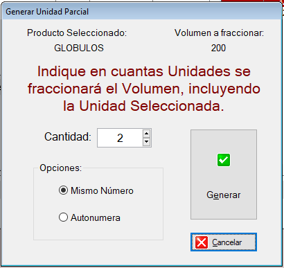 Las Unidades generadas tiendran los mismos datos solo que el volumen del producto será el resultado de la división del volumen original por la catidad de Unidades generadas.