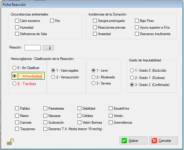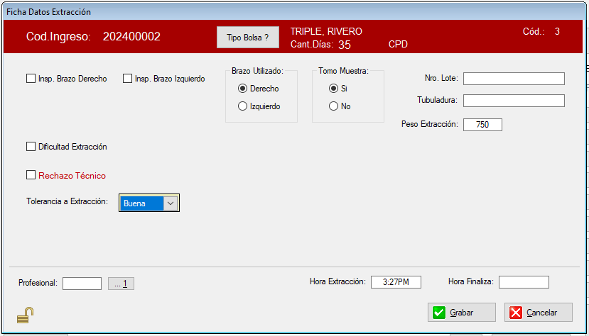 En Datos de Extracción si se carga Tolerancia a Extracción Mala o Regular se habilita el Botón de Reacción