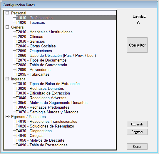 La ventana de Configuración de Datos contiene el acceso a las tablas del Sistema, las cuales deben estar definidas para la correcta implementación y debe estar supervisada por el jefe deservicio.