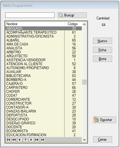 EJEMPLO: en la Tabla de Ocupaciones si se escribe 'AR' y luego botón <Buscar> o las teclas ALT+A se obtendria como resultado: