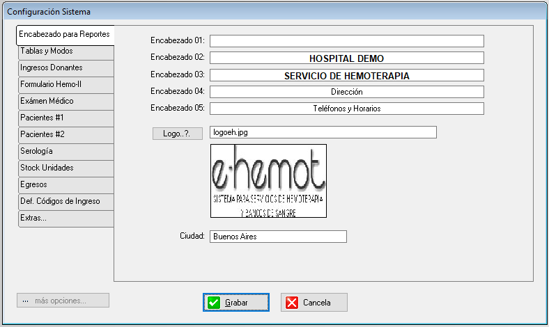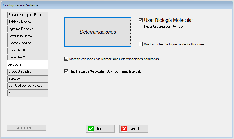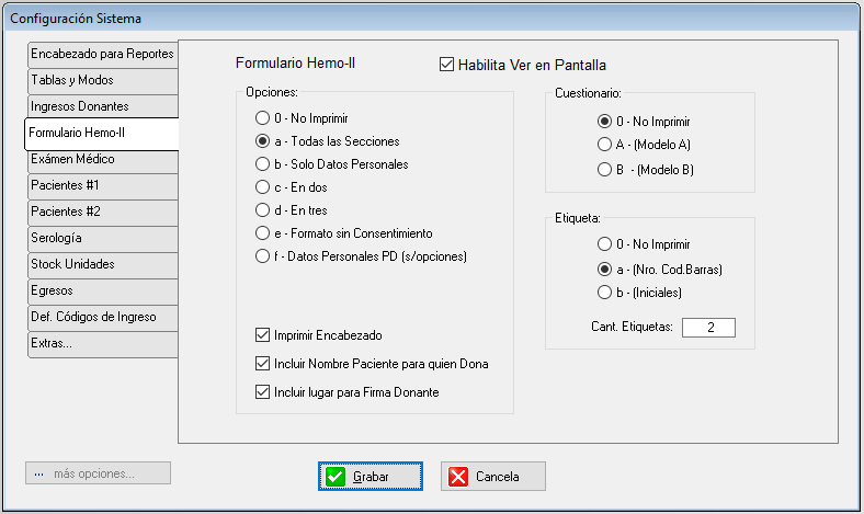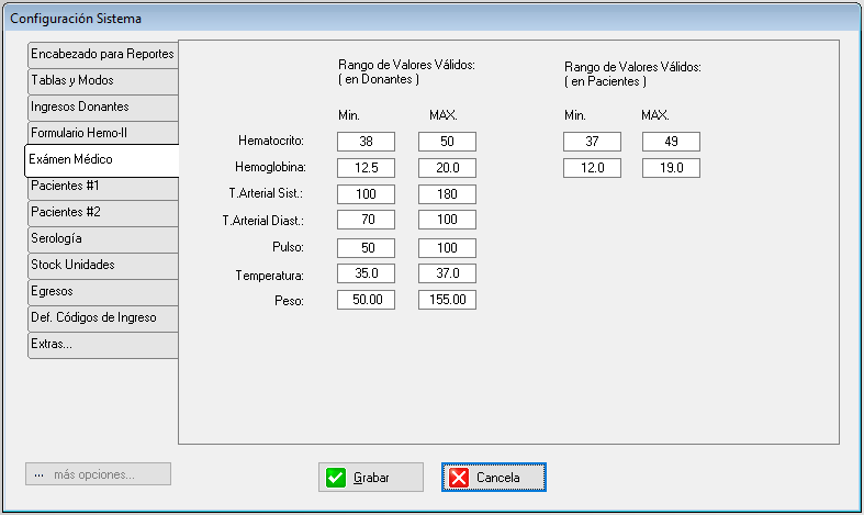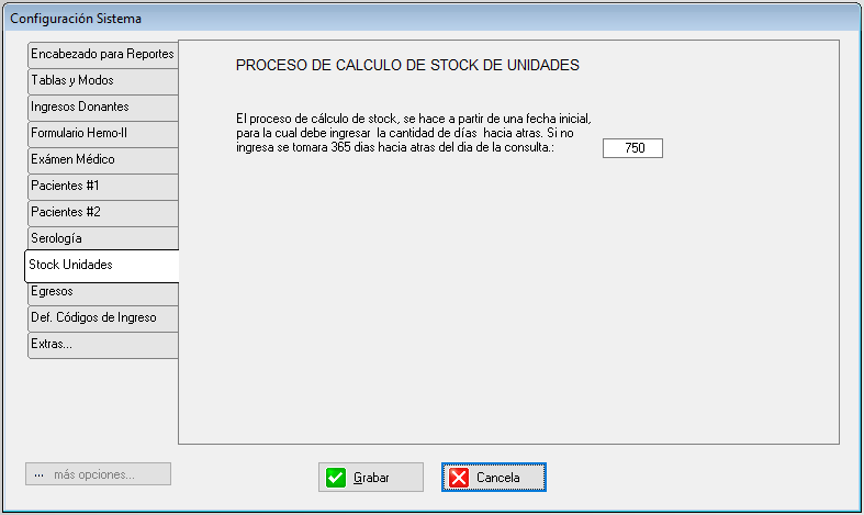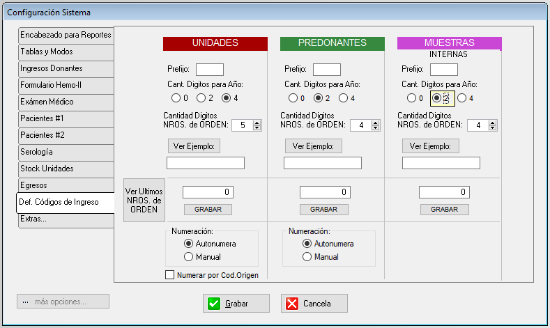 En el botón < ... más opciones > se habiltan opciones de configuración solo de acceso Supervisor en la cual se accede a la definición de la formación del Código de Ingreso de cada uno de los Ingresos: Unidades / Predonantes / Muestras