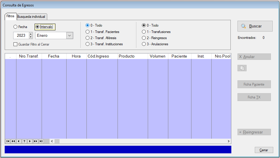 La solapa de Busqueda individual permite buscar por Nro.Transfusión o por Cod.Ingreso.