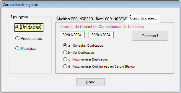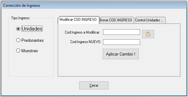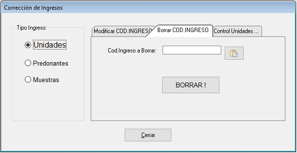 En caso de errores puede modificar o borrar Cod.Ingreso de Unidades / Predonantes / Muestras.