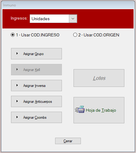 Desde esta ventana se pueden cargar los estudios Inmuno de los Ingresos (Unidades / Predonantes / Muestras ) de forma diferente a la carga que se hace renglón por renglón en la ventana de los mismos.