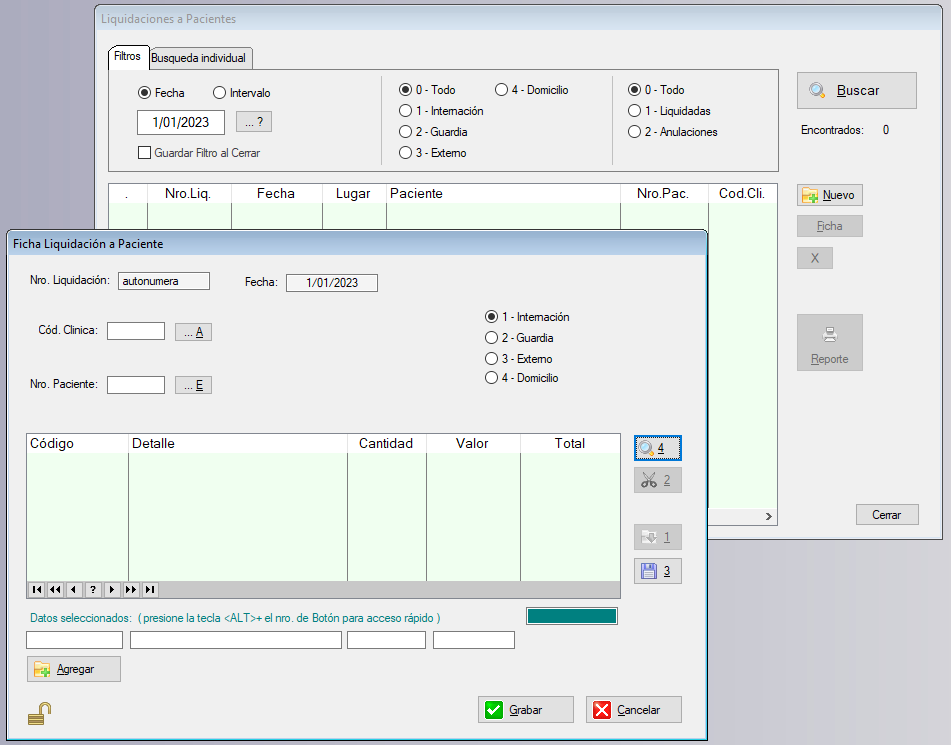 - Con el Botón de Liquidaciones se accede a la ventana de Liquidaciones a Pacientes.