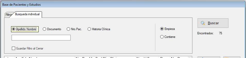 La solapa de Busqueda individual permite buscar por Apellido Nombre, Documento, Nro.Pac o por Historia Clinica.
