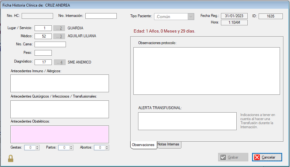 Esta ventana permiten registrar los Datos de los Pacientes que son estudiados en el servicio.