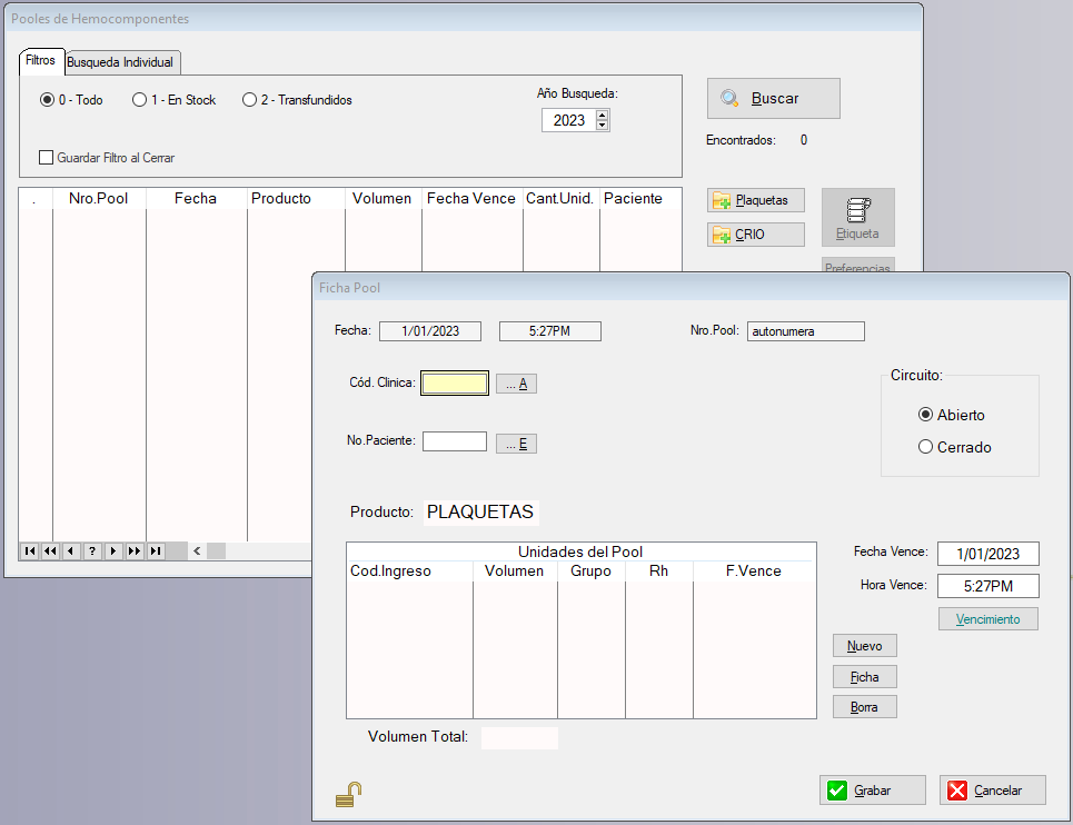 - Con el Botón de Pooles se accede a la ventana de Pooles de Hemocomponentes.