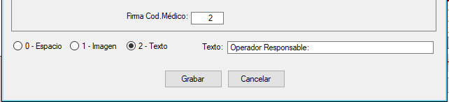 Esta opción pone el Texto que figura en Etiqueta (Operador Responsable) y abajo el Nombre del Médico y el campo Especialida/Matrícula según Firma Cod.Médico.