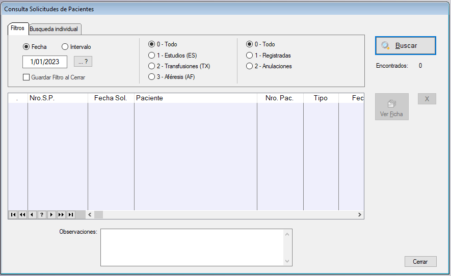 La solapa de Busqueda individual permite buscar por Nro.Solicitud, Nro.Pac.