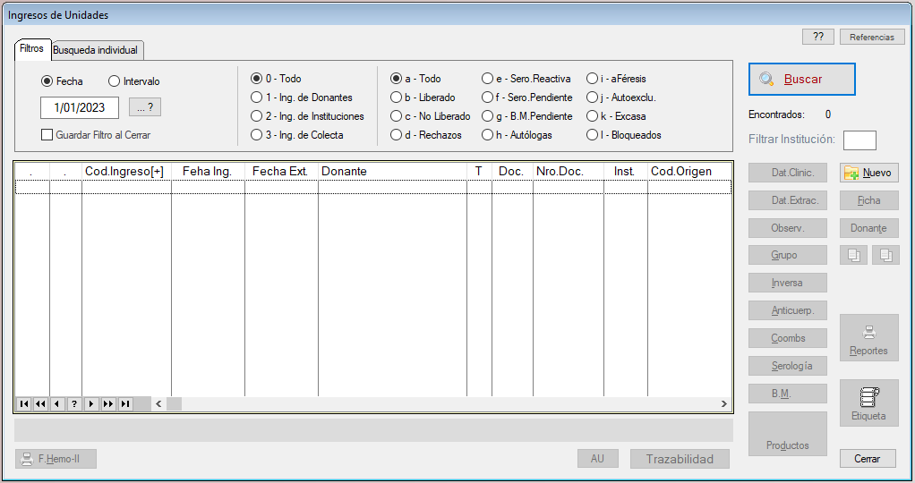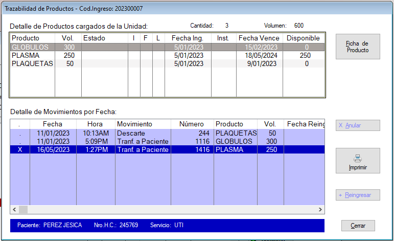 Botón Trazabilidad : Se puede consultar la carga inicial de Hemocomponentes y sus movimientos de egresos, con la posibilidad de Anular o Reingresar en caso de ser necesario.