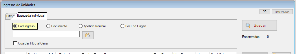 La solapa de Busqueda individual permite buscar por Cod.Ingreso, Documento, Apellido Nombre y Cod.Origen.