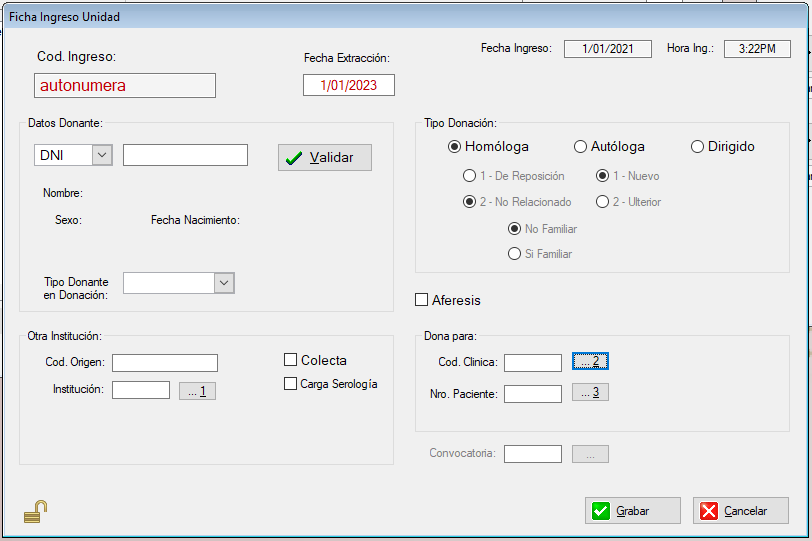 Si el Ingreso es de un Donante : se debe ingresar primero el Tipo y Nro de Documento y Presionar el Botón Validar , de esta forma el sistema verifica si el Donante ya Donó e informará si hay Alertas a tener en cuenta; Sino habilita para cargar los datos del Donante y lo dara de alta junto con el Cod.Ingreso generado correspondiente a la Donación.