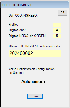 El Botón ?? que esta al lado del Botón Referencias se consulta el ultimo Codigo de Ingreso junto con la definicion de los componenetes de la Autonumeración.