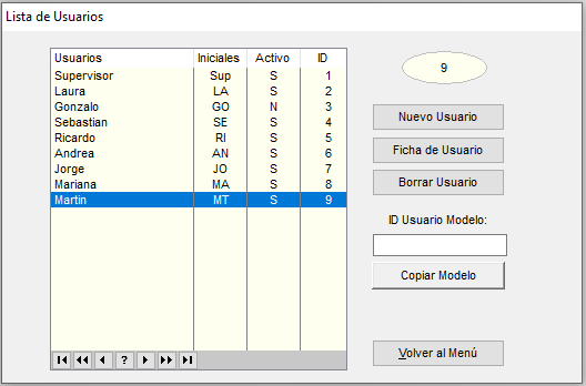 En esta ventana se encuentran las opciones para Nuevo Usuario / Ficha de Usuario seleccionado y Borrar Usuario seleccionado.