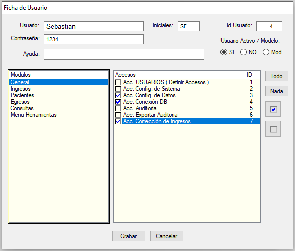 Con los Botones Todo y Nada se tildan todos los accesos del Módulo seleccionado.